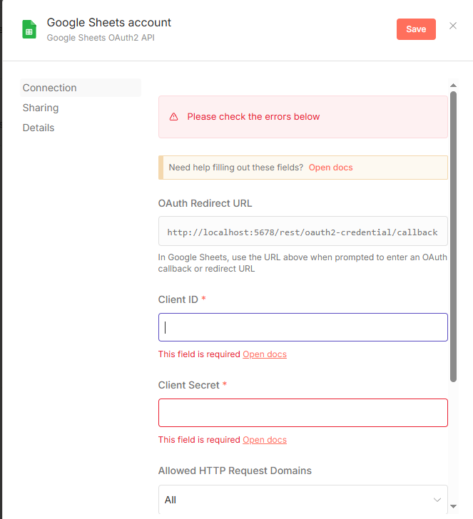 - n8n의 Credential 설정 창으로 돌아와서 알맞은 칸에 붙여넣습니다.
