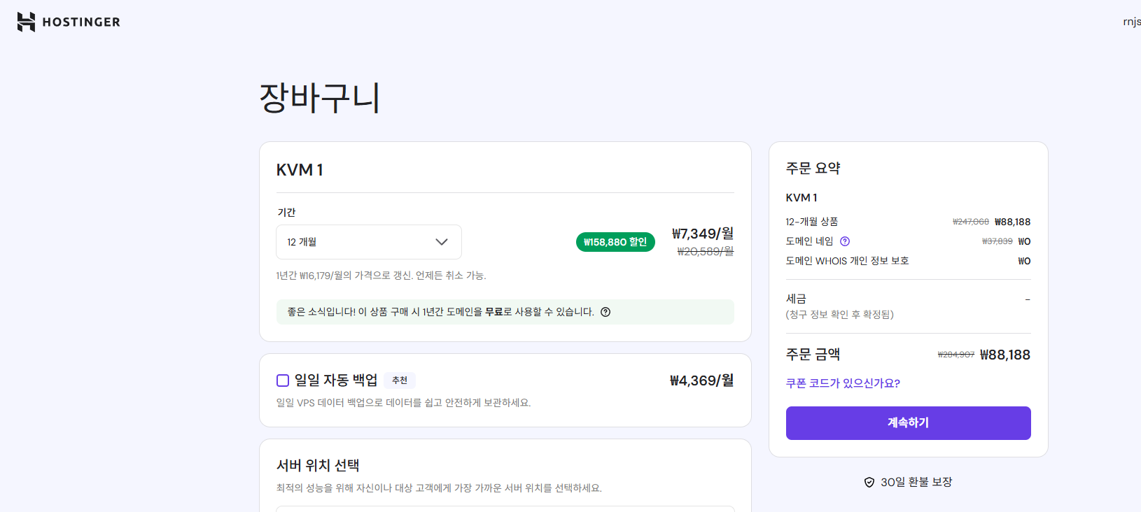 - 도메인 혜택: 12개월 이상 플랜을 선택하면 약 1.5만 원 상당의 도메인을 1년간 무료로 쓸 수 있습니다. IP 주소(예: 123.45.67.89) 대신 auto.yourdomain.com 같은 깔끔한 주소를 n8n에 연결할 수 있어 전문적인 느낌을 줍니다.